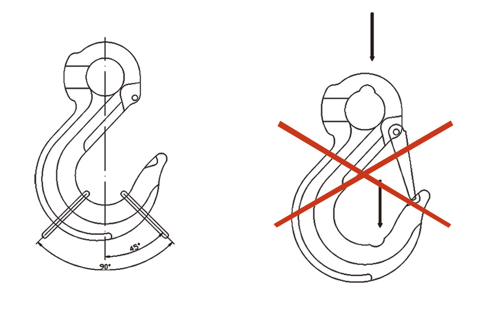 1.使用吊钩时,应将索具顶端部件挂入吊钩受力中心位置,不能直接挂入吊钩钩尖部位,如图: