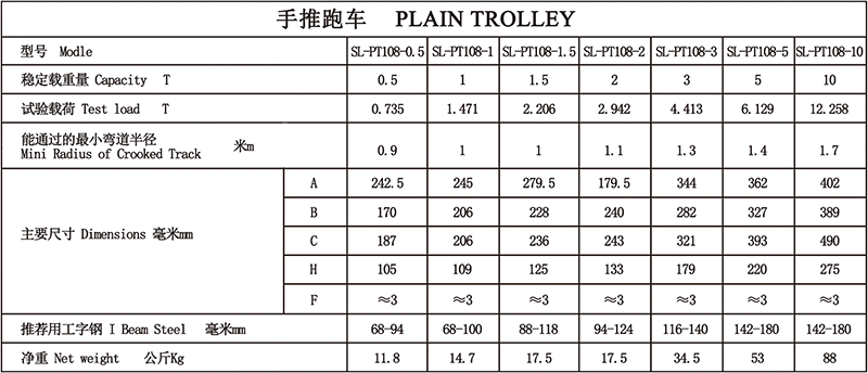 GCT系列手推单轨行车特点: 1、锻造的经过热处理的跑车轮,牢固耐用,运行平稳,可选配铸造跑车轮。 2、跑车轮有封闭式的轴承,运行更省力。 3、起重量1/2Ton-10Ton。 4、过弯能力良好
